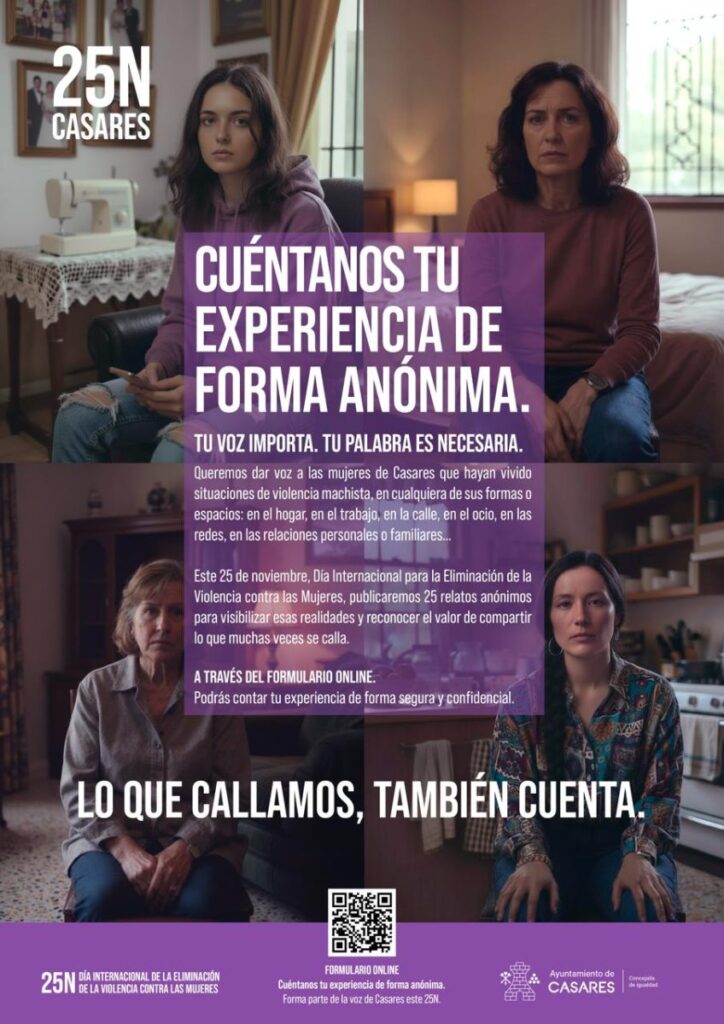 El Ayuntamiento de Casares, a través de la Concejalía de Igualdad, ha puesto en marcha una campaña basada en los testimonios reales de mujeres del municipio con motivo del 25 de noviembre, Día Internacional para la Eliminación de la Violencia contra las Mujeres. Bajo el lema «Lo que callamos, también cuenta», la iniciativa invita a las mujeres de Casares a compartir, de manera confidencial, situaciones de violencia o desigualdad que hayan vivido en cualquier ámbito de su vida.