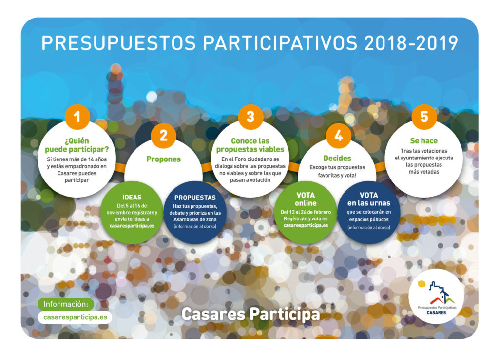 Esta es la tercera edición de este proceso de participación ciudadana del Ayuntamiento de Casares, una herramienta de dinamización vecinal que cuenta con una fase de recogida de propuestas en la calle, en las asambleas y a través de internet durante el mes de noviembre. Una vez que sean consensuadas todas las ideas planteadas por los participantes y vista la viabilidad de las mismas por parte del Ayuntamiento serán llevadas a votación, en la plataforma digital del 12 al 26 de febrero y en las urnas el 5 de marzo de 2019.