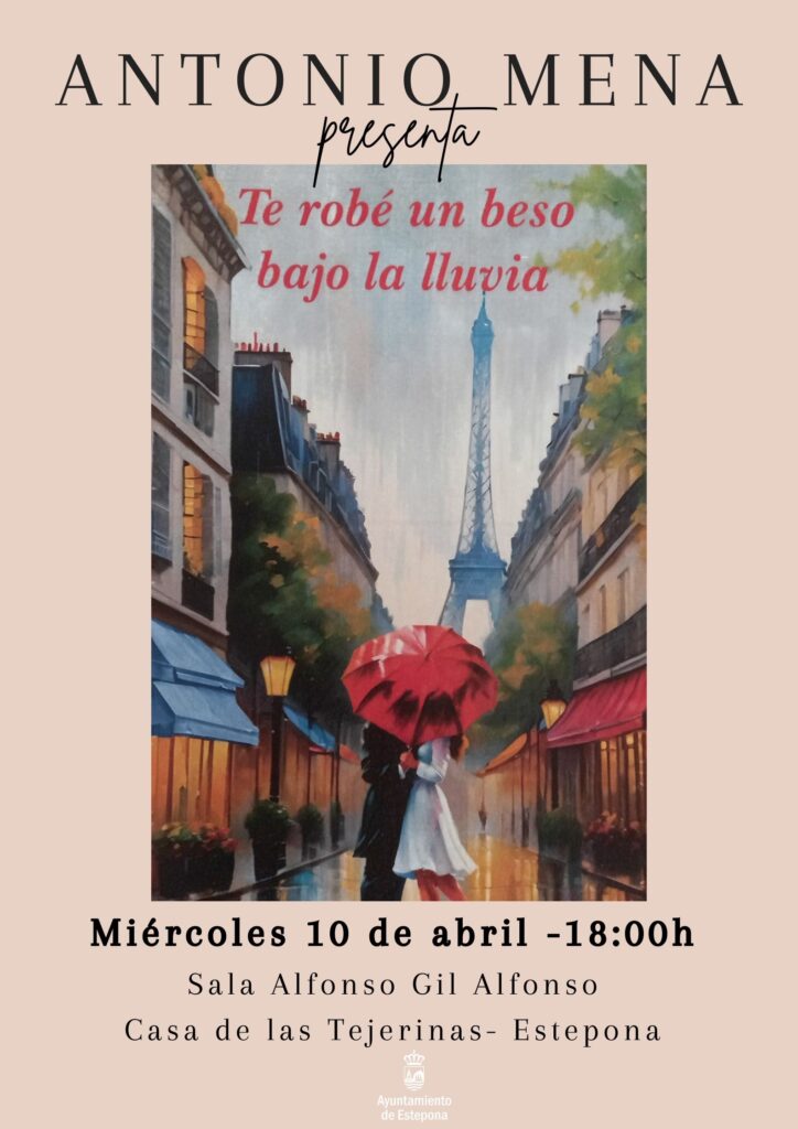 El próximo miércoles 10 de abril, a las 18.00 horas, tendrá lugar en la Sala Alfonso Gil Alfonso de la Casa de Las Tejerinas, sita en la Plaza de Las Flores, la presentación del poemario ‘Te robé un beso bajo la lluvia’, del autor esteponero Antonio Mena.