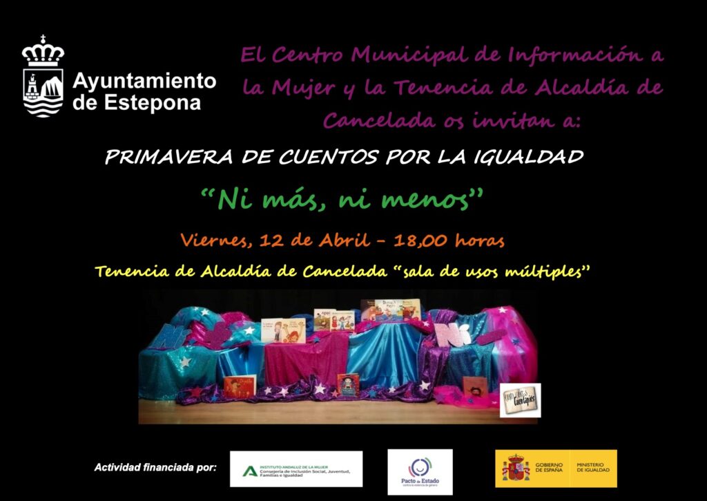 ‘Primavera de cuentos por la Igualdad’ es una actividad financiada por el Instituto Andaluz de la Mujer de la Consejería de Inclusión Social, Juventud, Familias e Igualdad, con cargo a los Fondos del Pacto de Estado contra la Violencia de Género de la Secretaría de Estado de Igualdad y contra la Violencia de Género del Ministerio de Igualdad.