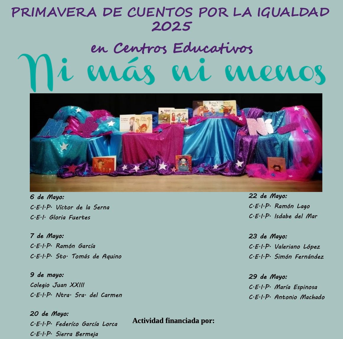 ‘Primavera de cuentos por la Igualdad’ cuenta con financiación del Instituto Andaluz de la Mujer de la Consejería de Inclusión Social, Juventud, Familias e Igualdad, con fondos procedentes del Pacto de Estado contra la Violencia de Género del Ministerio de Igualdad, lo que permite desarrollar estas acciones educativas para reforzar valores igualitarios entre la población infantil.