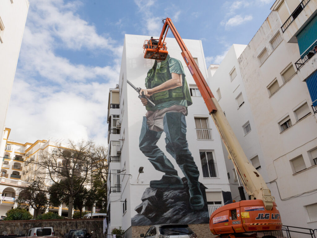 El Ayuntamiento de Estepona ha comenzado la restauración del mural ‘Día de Pesca’, una obra de arte urbano de casi mil metros cuadrados realizada en 2014 en la barriada Isabel Simón, que se vio afectada por trabajos de reparación contra humedades en la fachada principal del edificio.
