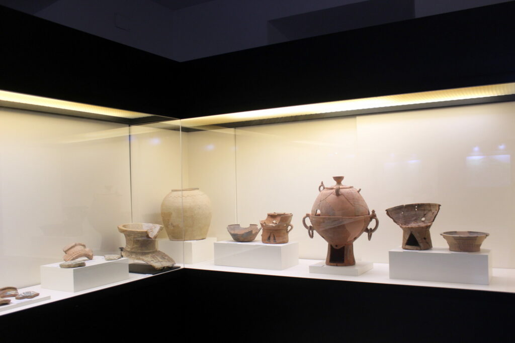 Las primeras piezas de esta exposición temporal se remontan al Paleolítico Inferior y Medio, con hasta 200.000 años de antigüedad. De época romana destacan un colgante infantil y una gran tinaja de procedencia itálica. La parte más importante de esta ampliación del Museo corresponde a época islámica, e incorpora una interesante serie de vasijas, pesas de mármol, instrumental de alfarería y una estela funeraria.