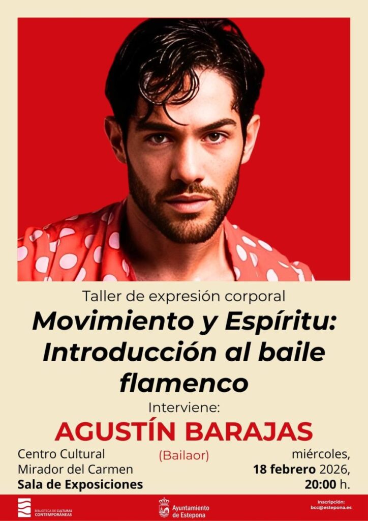El Ayuntamiento de Estepona informa que el bailaor y coreógrafo Agustín Barajas impartirá un taller gratuito de expresión corporal El movimiento es espíritu: introducción al baile flamenco. La actividad se enmarca dentro de la programación cultural del primer trimestre de la Biblioteca de Culturas Contemporáneas y tendrá lugar el 18 de febrero a las 20:00 horas. El taller está dirigido a todos los públicos.