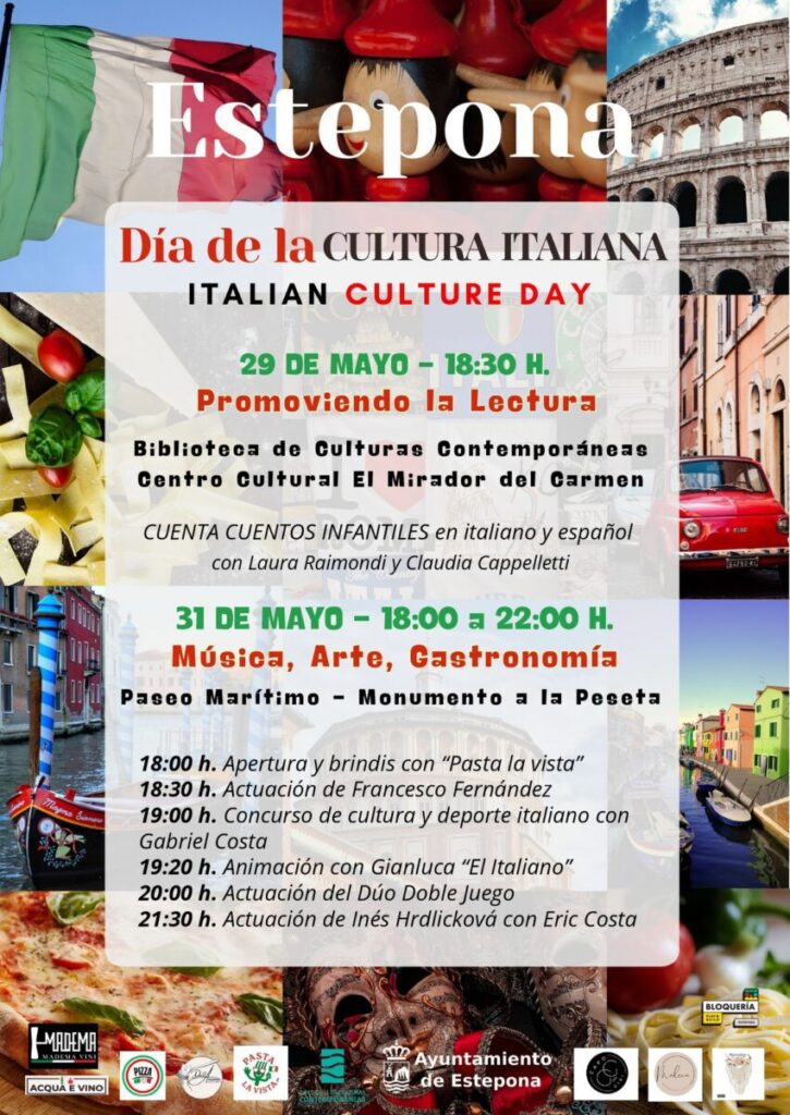 Estepona acogerá el Día de la Cultura Italiana el próximo 31 de mayo de 18:00 a 22:00 horas en la avenida de España, junto al Monumento a La Peseta, como parte del programa municipal ‘Compartiendo Culturas’ destinado a fomentar la integración de los residentes extranjeros. El evento fue presentado por la teniente alcalde del área de Extrarradio, Begoña Ortiz, y la coordinadora Simona Sorrenti el 20 de mayo.