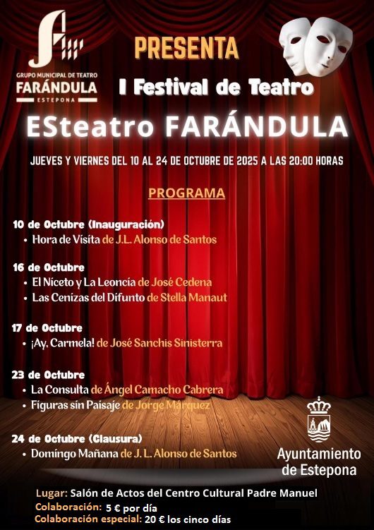 El Grupo Municipal de Teatro Farándula presenta la primera edición del Festival ESteatro Farándula, que incluye siete representaciones teatrales entre el diez y el veinticuatro de octubre en el Centro Cultural Padre Manuel de Estepona. Las funciones se celebrarán los jueves y viernes a las veinte horas, con una colaboración de cinco euros por día o veinte euros por los cinco días completos.