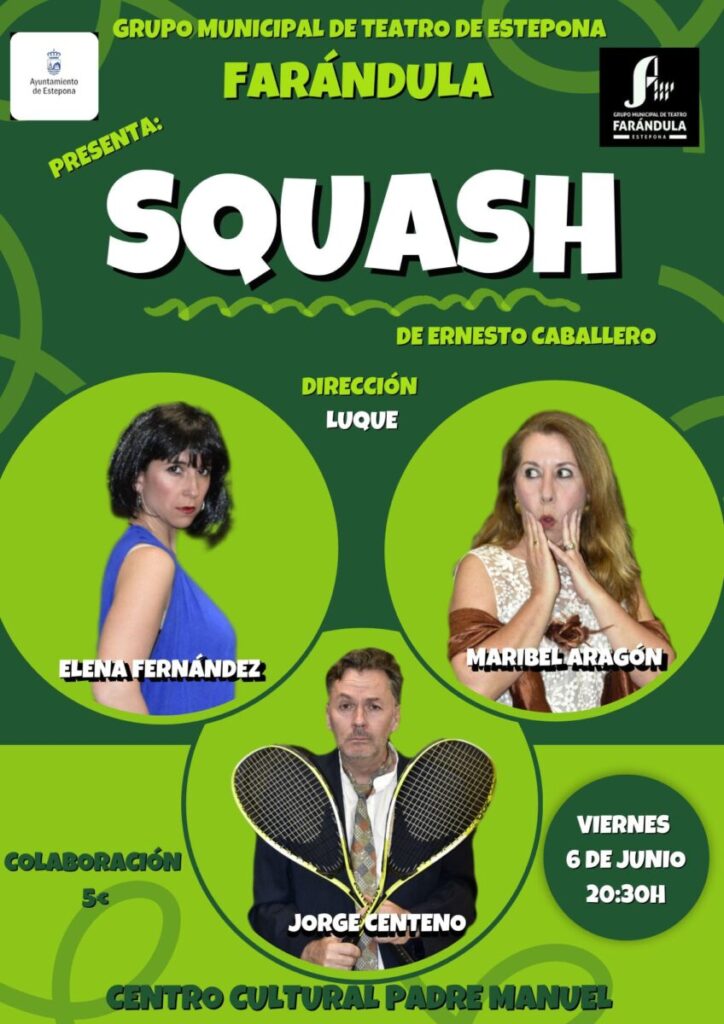 El Grupo Municipal de Teatro ‘Farándula’ de Estepona presentará la comedia ‘Squash’, del dramaturgo Ernesto Caballero, el próximo viernes 6 de junio a las 20:30 horas en el Centro Cultural Padre Manuel. La obra estará protagonizada por los actores Jorge Centeno, Maribel Aragón y Elena Fernández, bajo la dirección de Jesús Luque, según informó el Ayuntamiento de Estepona el 16 de mayo.