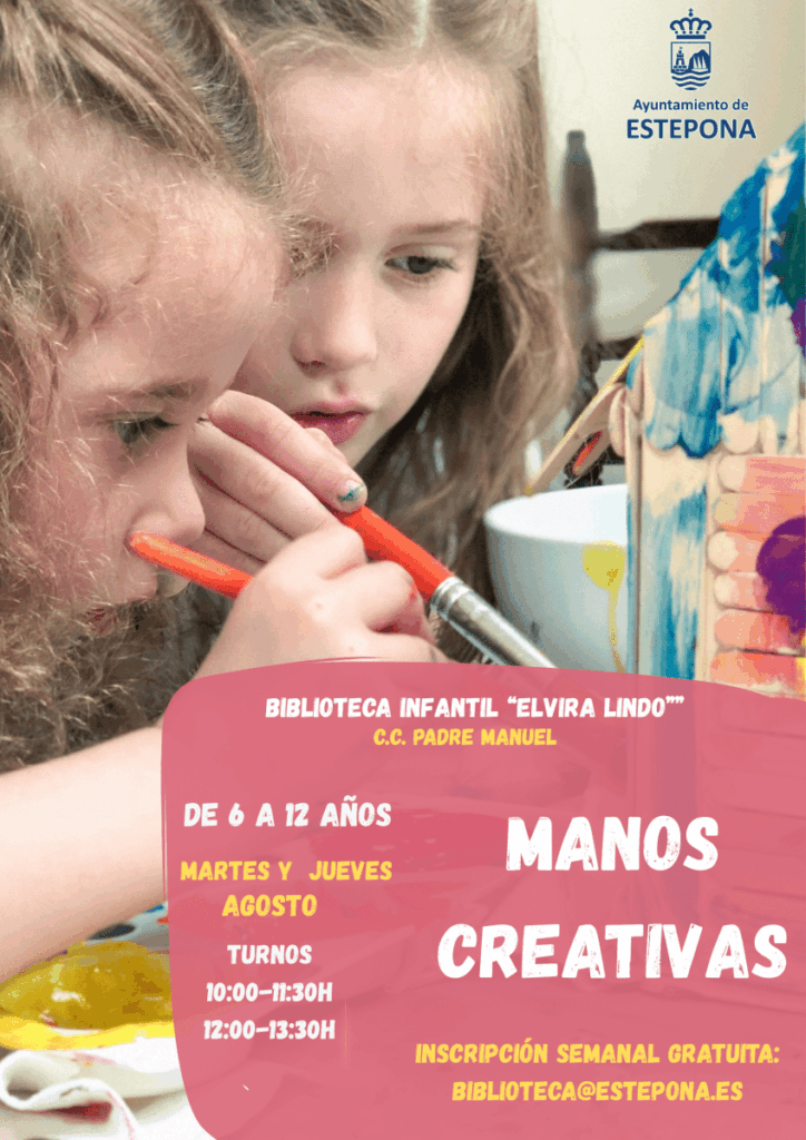 La Biblioteca Municipal de Estepona organiza el taller gratuito ‘Manos creativas’ durante agosto en la Sala Infantil Elvira Lindo del Centro Cultural Padre Manuel. La actividad está dirigida a niños de entre 6 y 12 años con sesiones los martes y jueves por la mañana.