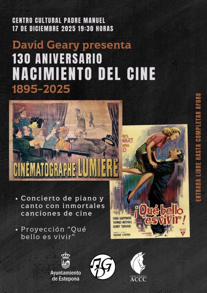 El Ayuntamiento de Estepona conmemora el 130º aniversario del nacimiento del cine con un concierto cinematográfico y la proyección de la película ‘¡Qué bello es vivir!’ el miércoles 17 de diciembre a las 19:30 horas en el Centro Cultural Padre Manuel. El acceso será libre hasta completar aforo.