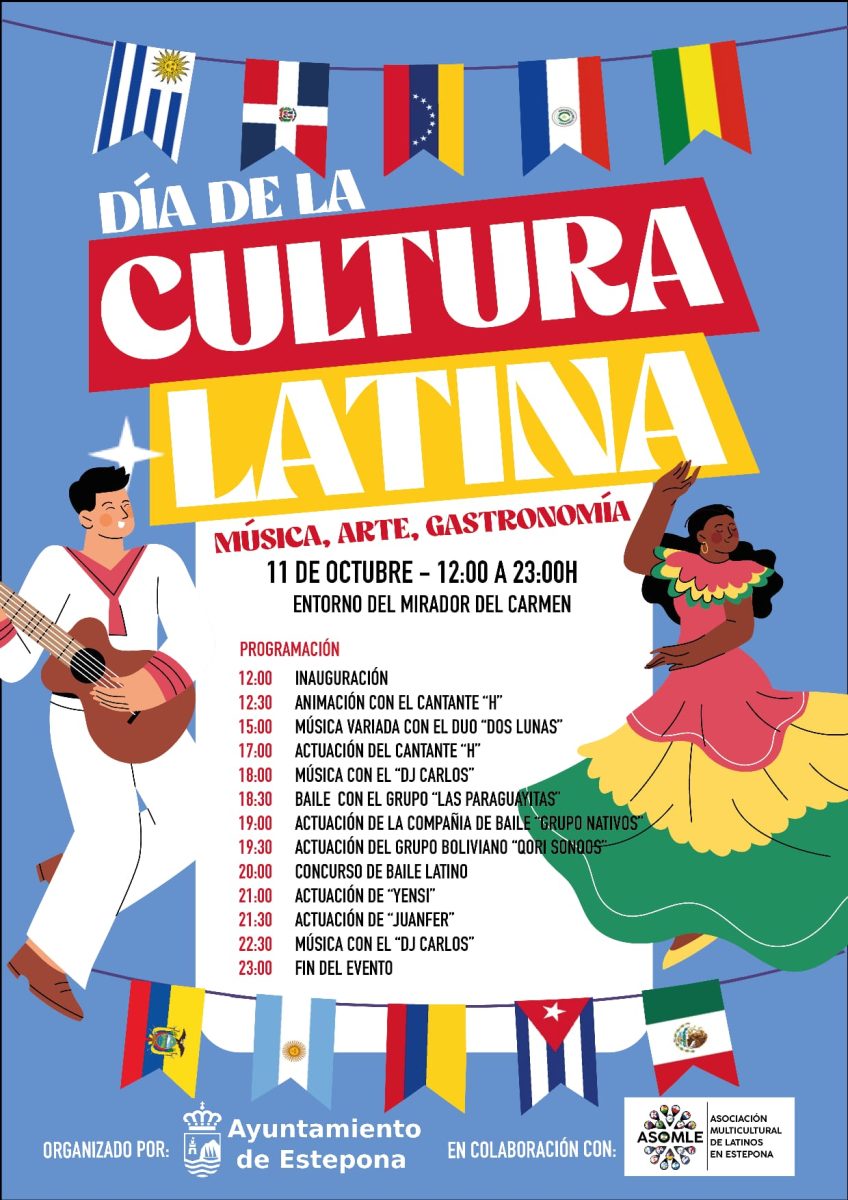 El Ayuntamiento de Estepona organizará el Día de la Cultura Latina el próximo sábado 11 de octubre en el Mirador del Carmen, con horario ininterrumpido de 12:00 a 23:00 horas. El evento forma parte del programa municipal «Compartiendo Culturas» y de la programación especial «Estepona vive sus calles» en otoño, que se desarrollará del 10 al 12 de octubre.