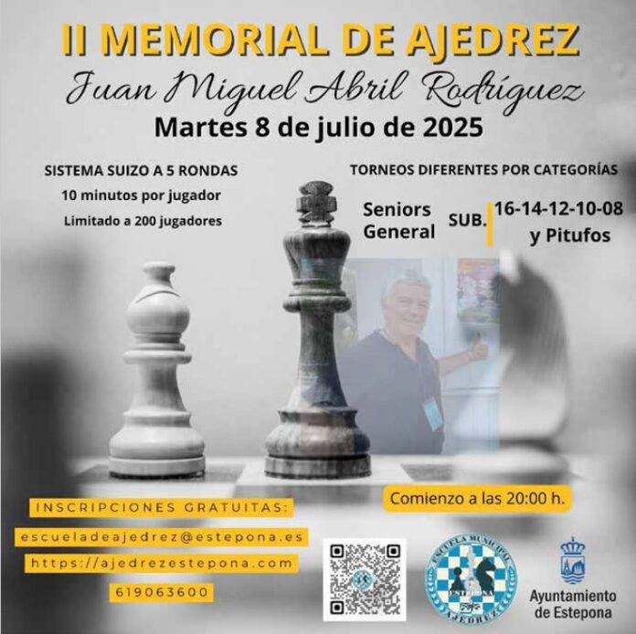 El Ayuntamiento de Estepona organiza el II Memorial Juan Miguel Abril Rodríguez el próximo martes 8 de julio de 20:00 a 24:00 horas en los tableros de ajedrez del Paseo Marítimo. El torneo se celebra en recuerdo del Gran Maestro del Ajedrez y director de la Escuela Municipal de Ajedrez de la localidad.