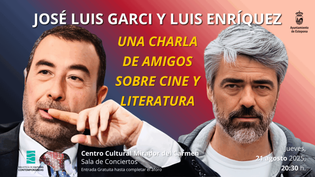 El director de cine José Luis Garci y el gestor de medios Luis Enríquez protagonizarán el próximo 21 de agosto un encuentro en el Centro Cultural Padre Manuel de Estepona. La actividad, titulada «Una charla de amigos sobre Cine y Literatura», comenzará a las 20.30 horas con entrada gratuita y moderación del periodista Francisco Reyero. Los protagonistas ofrecerán su visión sobre el cine y la literatura, además de abrir el debate al público asistente.