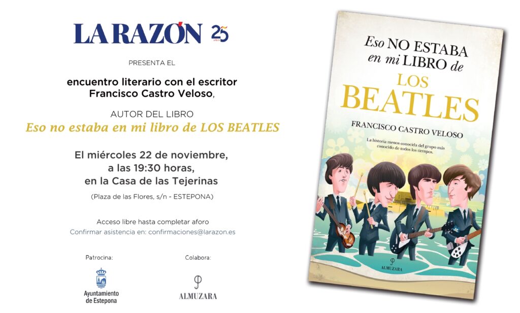 El próximo miércoles, 22 de noviembre, a las 19.30 horas, tendrá lugar la presentación de la obra ‘Eso no estaba en mi libro de los Beatles’ de Francisco Castro Veloso. En este libro publicado por la editorial Almuzara, el escritor relata la historia menos conocida del grupo más conocido de todos los tiempos. El acto, que se celebrará en la Casa de Las Tejerinas, estará conducido por el periodista y delegado en Andalucía de ‘La Razón’, José Lugo.