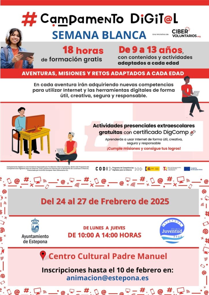 El Ayuntamiento de Estepona ha abierto las inscripciones para un campamento digital que se realizará del 24 al 27 de febrero en el Centro Cultural Padre Manuel, dirigido a niños y adolescentes de 9 a 13 años, con el objetivo de desarrollar sus competencias digitales a través de talleres sobre uso seguro y responsable de Internet.