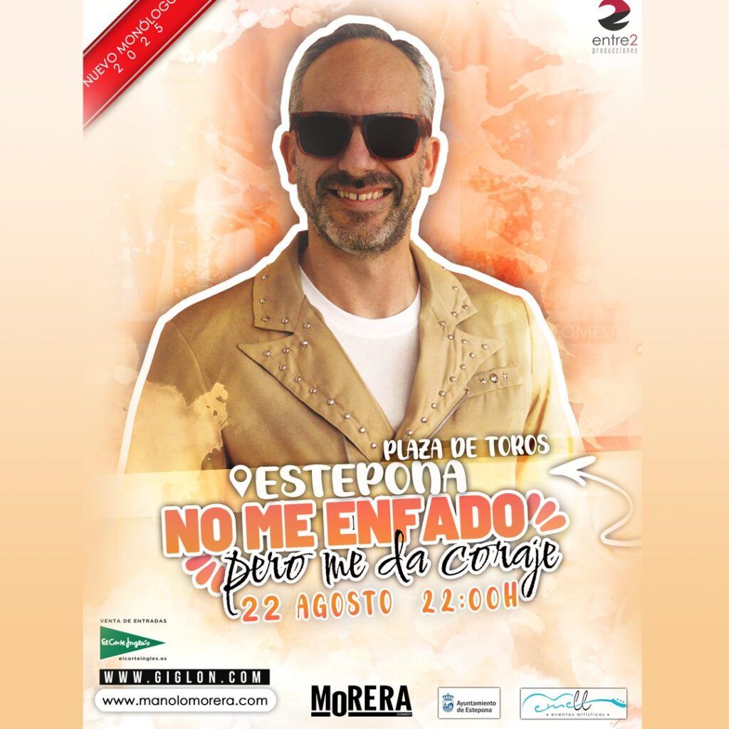 El humorista gaditano Manolo Morera actuará el viernes 22 de agosto a las 22.00 horas en la Plaza de Toros de Estepona con su espectáculo ‘No me enfado, pero me da coraje’. Las entradas están disponibles en El Corte Inglés, giglon.com y manolomorera.com.