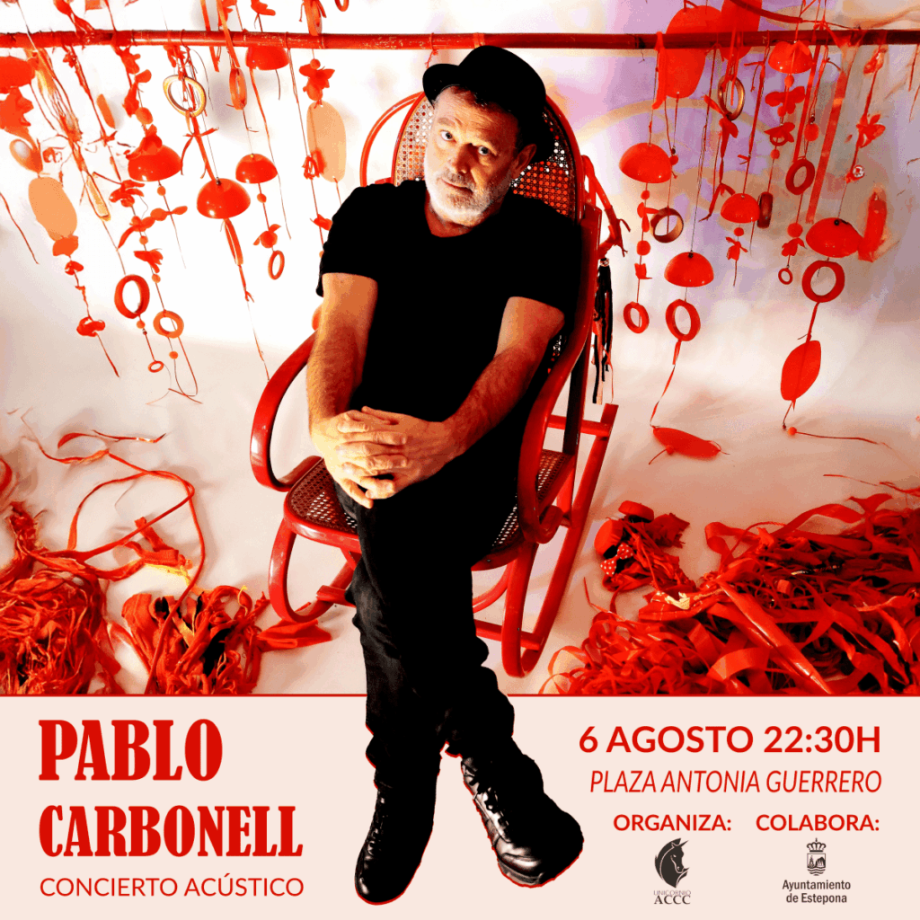 Pablo Carbonell ofrecerá un concierto en acústico el próximo 6 de agosto a las 22:30 horas en la Plaza Antonia Guerrero de Estepona. La actuación está organizada por la Asociación Cultural Unicornio con la colaboración del Ayuntamiento y el acceso será libre.