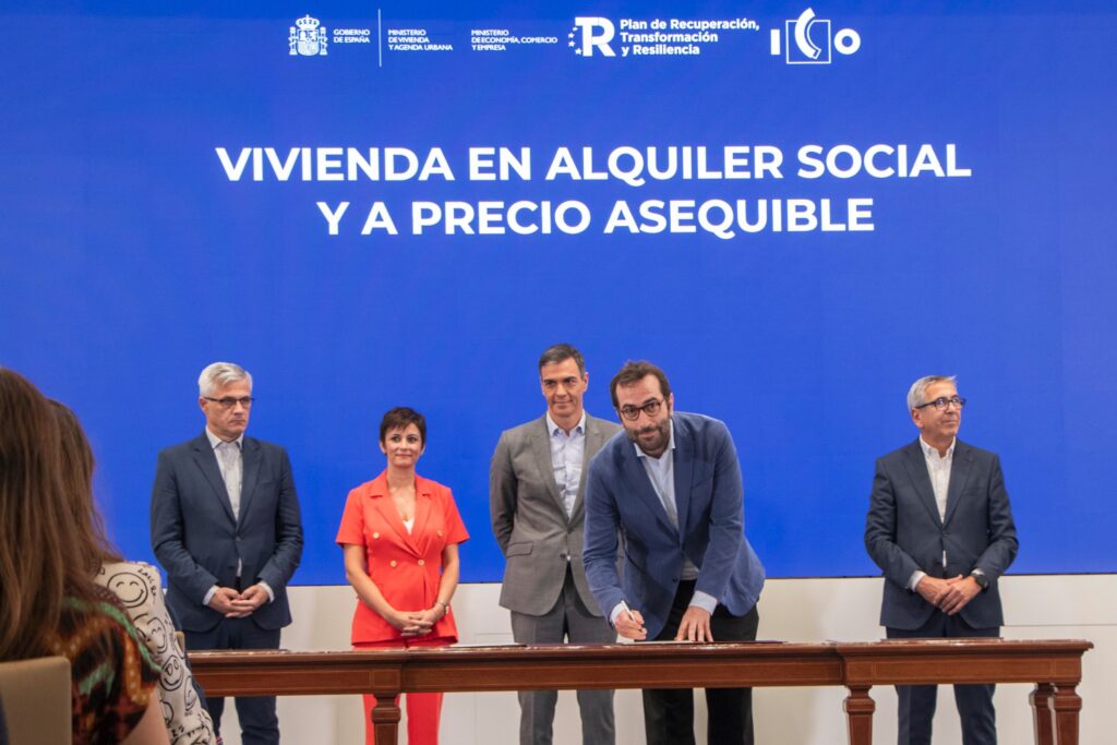 El presidente del Gobierno, Pedro Sánchez, ha presidido esta mañana el acto en el que se han suscrito los acuerdos entre el Ministerio de Vivienda y Agenda Urbana y el Ministerio de Economía, Comercio y Empresa, por parte de sus titulares, Isabel Rodríguez y Carlos Cuerpo, por los que se movilizan 6.000 millones de euros a través del Instituto de Crédito Oficial (ICO) para la construcción de vivienda en régimen de alquiler asequible. Estos 6.000 M€ se dividen en dos líneas de inversiones, en primer lugar, 4.000 M€ en préstamos para promotores públicos y privados, procedentes de la Adenda del Plan de Recuperación, Transformación y Resiliencia (PRTR); y, en segundo lugar, una línea dotada con 2.000 M€ que avalará hasta el 50% de estos préstamos, impulsada por el Gobierno de España y gestionada a través del ICO.